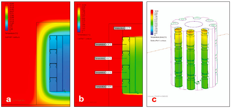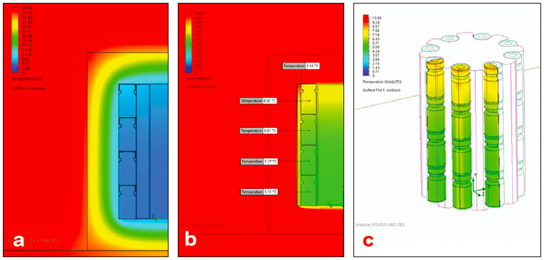 Figure 4a shows the temperature distribution between 0°C and 40°C. Figure 4b shows the temperature distribution of between 0°C and 10°C, which illustrates the difference in temperature in the water. That the upper vaccine has the highest temperature is a good result. Figure 4c is a surface plot for the vaccines, showing again that vaccine 1 has the highest temperature. Also you can see that the top of vaccine 1 is a lot warmer.