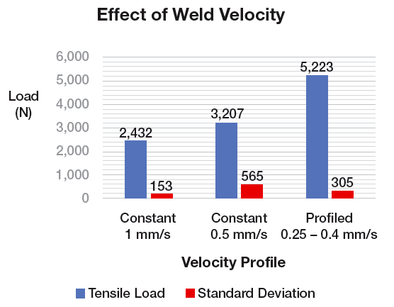 Experiments were completed in which the weld velocity was varied, and the resulting strength and appearance of the welds were evaluated against the stringent requirements of the medical industry. Analysis of welded cross sections suggests that higher weld strength was associated with a linearly increasing weld velocity profile.