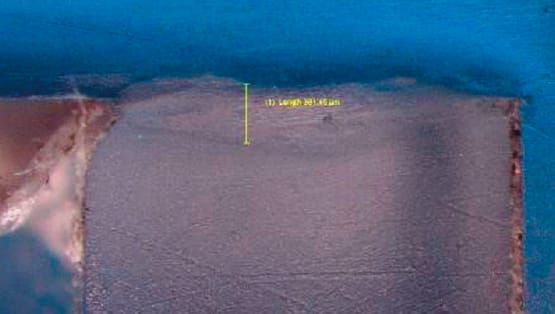 Stronger Welds. Microscopic investigation of welded parts using linearly increasing weld velocity provides insight into the physical characterization of the weld regions. The length and depth of the weld zone correlates closely with the tensile strength of the samples, with a larger zone producing higher tensile strength values. Samples that had full coverage of the contact area, as well as resultant deeper penetration, showed high strength. These larger, more uniform melt regions penetrated well into the surrounding material.