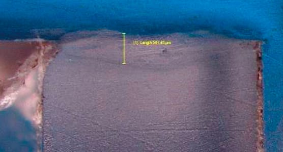In welds performed with a linearly increasing velocity profile, the melt layer buildup takes place not only in the volume of the energy director, but also within the mating part surfaces. This forms a uniform melt layer in the contact area of both parts and is apparent in the melt zone shape observed under the microscope (see Figure 4). This zone extends into both parts of the assembly, and its size correlates strongly with high strength welds.