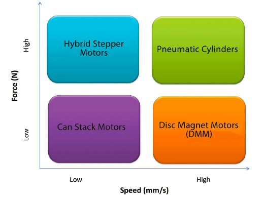 The four block matrix in Figure 1 shows a broad classification of linear actuators based on load-lifting capability at various speeds. A linear speed of over 500 mm/s can be considered as a high-speed range. Can stack motors are widely used as linear actuators in the low-load/low-speed segment because of their reliability and cost-effectiveness. Hybrid stepper motors are well known for their high load-lifting capacity over other stepper technologies and are the best choice for high-load/low-speed applications. The remaining low-load/ high-speed segment is the focus of this article.