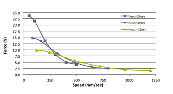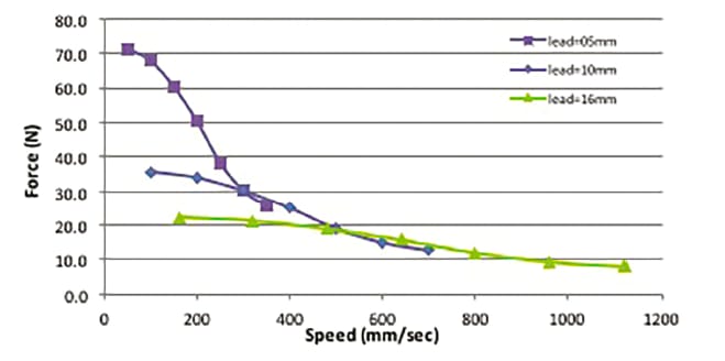 The disc magnet motor, often called the turbo disc motor, is an ideal choice for high-speed applications with low loads. As the name suggests, DMM uses a thin magnetic disc to generate the torque output of the motor. Because of its low rotor inertia, it provides an exceptionally high acceleration for a given torque, which is suitable for most of the high-speed demands. Its advantages are not well known, and so it is often overlooked as an option. Figures 2a and 2b are typical examples of a linear actuator that could be designed from existing DMMs. The designs can be either a rotating screw as in Figure 2a or a rotating nut as in Figure 2b. Figures 3 and 4 show the performance of a DMM actuator for various lead screw combinations. These actuators provide a wide range of speeds in the low-load region between 0 to 1200 mm/s, which is quite wide compared with a hybrid stepper motor or can stack motor of same frame size.