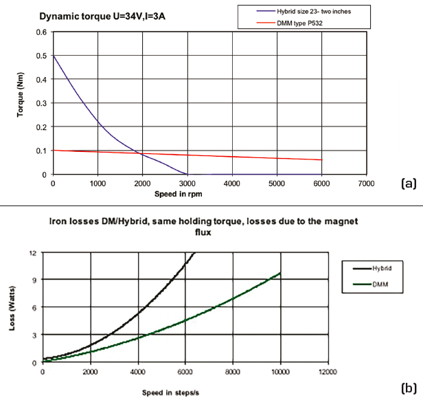 As mentioned earlier, the unique rotor design of the DMM keeps the inertia exceptionally low compared with a hybrid stepper. For a given frame size, 40 × 40 mm, the rotor inertia of DMM is as low as 3 gram-cm2, which is 15 times lower than similar sized hybrid motors. This translates to the acceleration being 15 times higher for a given torque output. The rotor inertia mismatch is also an important selection criterion for high-speed actuation.