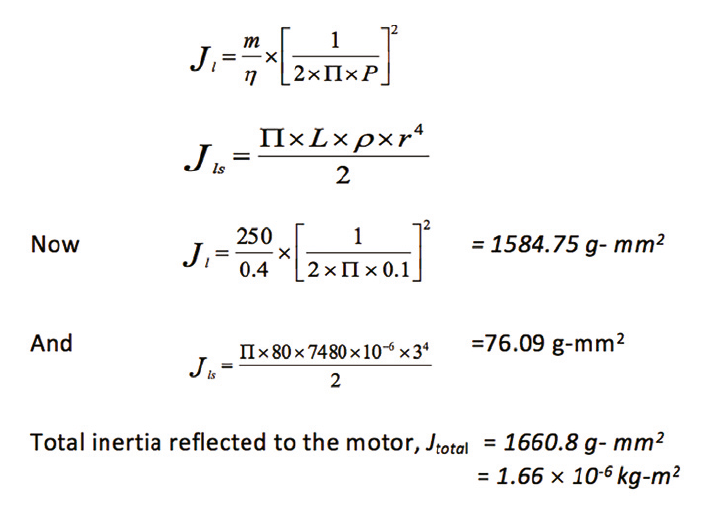 The following example illustrates how suitable a DMM motor can be in case of load inertia mismatch challenges. A load of 250 g is to be moved to a distance using a lead screw of Ø6 × 80 mm long with a lead of 10 mm. How do we calculate load inertia reflected on to the motor? Efficiency can be considered roughly as 40 percent and the material for lead screw is stainless steel. The total inertia reflected to the motor (Jtotal) = load inertia (Jl) + lead screw inertia (Jls).