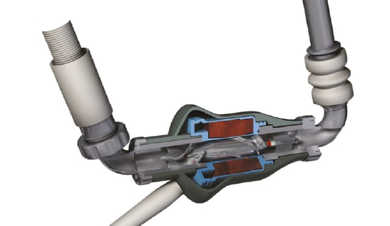A permanent magnet in the pump rotor is driven by 12 coils in the stator. The coils exert a torque on the rotor, as well as provide active control of the position of the rotor axis. The vertical position — or levitation — of the rotor is accomplished by magnetic field line tension and does not need active control. The rotor receives blood axially and redirects it radially, into the volute, or fluid collector (see Figure 3). Some of the blood backflows around the outer edge of the rotor and flows back into the rotor inlet, resulting in a constant washing of the blood, which serves to eliminate places where the blood can stagnate and clot.