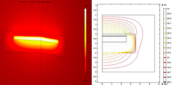 The wireless power transfer system induces small currents in the body tissue near the coils. Hansen modeled the heat generated in the tissue as a result of the induced currents (see Figure 5), combined this with models of heat generated inside the implant (in magnetic wires, electronics, and batteries), and then used the thermal conductivity coefficient that was determined from the simulated Cleveland Clinic study to determine the temperature in body tissue near the implant.
