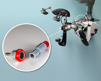 For Mari, the customized, application-specific ODU connectors together with the cable assemblies are key components of the overall system, ensuring reliable power and signal transmission between the control unit and the monitoring system of the surgical microscope. Not only does the system contain ODU’s connectors on each side of the Mari device, but additional ODU Mini-Snap push-pull connectors with a total of six different cable assemblies are used within the precision control system. The highly reliable circular ODU Mini-Snap connectors serve a dual purpose of supplying the control unit and small electromagnets with power and for ensuring an uninterrupted signal transmission to the microscope.