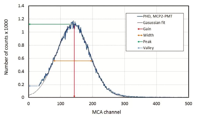 The PHD shown in Figure 3 was measured with low input background light illumination, keeping the count rate below a few hundred hertz. The MCP voltage of 1625 V (for dual MCP) yields electron gain of 1.1 × 105. The DCR originating from the photocathode was approximately 30 Hz/cm2, while the MCP contribution was negligible at In the resulting PHD (blue curve), the peak is well separated, with a low-energy valley and noise below the threshold. The peak is described well by a Gaussian distribution (solid black curve). The gain point (G) corresponds to the mean energy of the PHD and is just slightly above the position of the PHD peak. Both the peak-to-valley (P/V) ratio and the full width half maximum-to-gain (W/G) ratio are typically used to characterize photon counting detectors. Here the measured values are P/V ≈ 6 and W/G ≈ 0.86, which are the best available for dual MCP-PMTs.