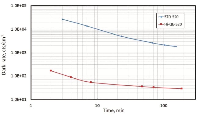 When monitoring the DCR of low-rate single photons, it is critical that the dark rate is kept as close to zero as possible. High DCRs often interfere with the accurate identification of a single photon event, which can result in false-positive tests in medical imaging applications. In order to test the performance of the Hi-QE photocathode, it was compared to the evolution of the standard S20 cathode. Figure 2 shows the dark rate versus time at room temperature (23 °C) for a standard S20 and the Hi-QE blue S20 photocathode. It was observed that an extremely low dark rate of Figure 2 illustrates that it takes about 2–3 hours to reach the low-rate plateau. The high dark rate measured at the beginning is believed to originate from population by ambient light of long-living surface and bulk states, lying above Fermi level. It takes time to discharge these states, with a decay time also an important criterion of the detector performance. For Hi-QE photocathodes, the growing process was adjusted to keep a low dark rate and to ensure quick discharge of surface and bulk states.