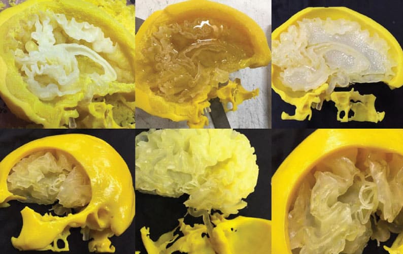 The combined teams from Stratasys Direct and the university chose PolyJet Rigid VeroYellow for the skull and an over-molded TangoPlus material with a durometer of Shore 27A for the brain. The TangoPlus brain was built as a multifunctional piece. Initially, it served as the solid brain. Within the CAD design, the aneurysm was 3D printed according to the aneurysm pattern experienced by the actual patient. Finally, the skull was built with the inner support material that hugged the grooves and depressions of the sulci and gyri likeness of the patient's brain. This support material served as the pattern for creating the inner brain matter.