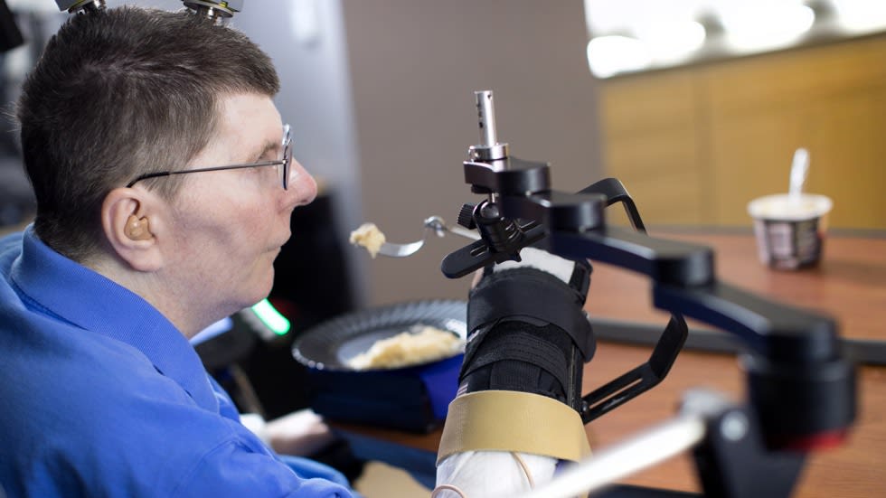 New research from Brown University (Providence, RI) describes how the BrainGate brain-computer interface, combined with a functional electronic stimulation system implanted in the arm of a Cleveland man with quadriplegia, allowed him to move his arm and hand again to eat mashed potatoes, drink water from a mug, and scratch his nose.