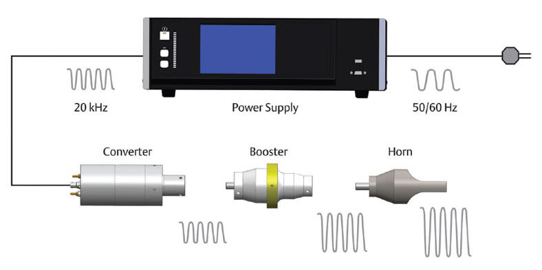 In ultrasonic welding, high-frequency vibrations are applied to two parts or surfaces by a vibrating tool, commonly called a horn or sonotrode. Welding occurs as the result of heat generated at the interface between the parts. The ultrasonic vibrations are created by a series of components — the power supply, converter, booster, and horn — that deliver mechanical vibration to the parts.