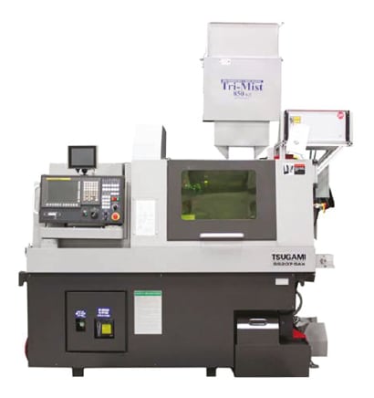 A high-performance turning center from Tsugami/Rem Sales, Windsor, CT, performs continuous live cutting using a servo-driven B axis. Designed for complex small parts, the Tsugami SS207-5AX Swiss type lathe with B axis combines Swiss style machining with laser cutting on one machine. The live tools mounted on the B axis (three front, three rear) machine in coordination with the C axis, enabling the machine to cut precise angles and sculpted contours. The swiveling B axis transforms this Swiss type lathe into a multitasking turning center that can drill, tap, and end mill any angle.
