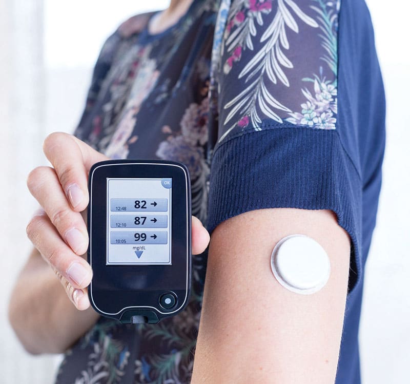 Continuous Glucose Monitoring. These devices measure glucose levels 24/7. Devices vary in the special features they offer, but all basically work by using a tiny electrode/glucose sensor inserted under the skin to measure glucose levels in tissue fluid. A transmitter sends data wirelessly to a monitor that, in turn, alerts the patient if the glucose level is in a danger zone (too high or too low). This area is advancing rapidly, but most devices currently on the market still require minimal finger pricking to calibrate their sensor accuracy.