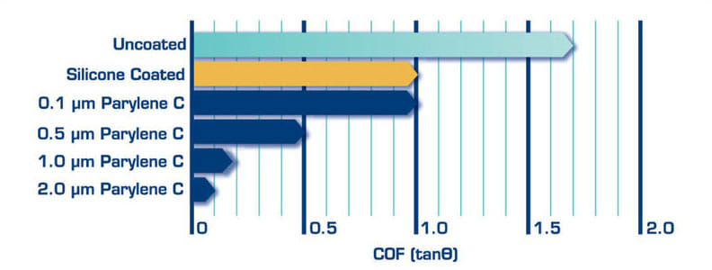 Parylene is typically applied in thickness ranging from 500 Å to 75 μm, maintaining excellent properties in ultrathin films. A 25-μm coating, for example, will have an electrical insulating capability of 7,000 V. No other coating material can be applied as thin as Parylene and still provide the same level of protection. The molecular “growth” of Parylene coatings ensures not only a uniform conformal coating at the thickness specified by the manufacturer, but because Parylene is formed from a gas, it ensures complete encapsulation of all surfaces without blocking or bridging small openings. All Parylene variants are free of fillers, stabilizers, solvents, catalysts, and plasticizers. As a result, the Parylenes present no leaching, outgassing, or extraction issues. Its naturally low coefficient of friction provides dry-film lubricity properties that benefit moving parts, including syringe and infusion device applications, eliminating the need for silicone oils that are often used as a lubricant in syringe-type devices (see Figure 3).
