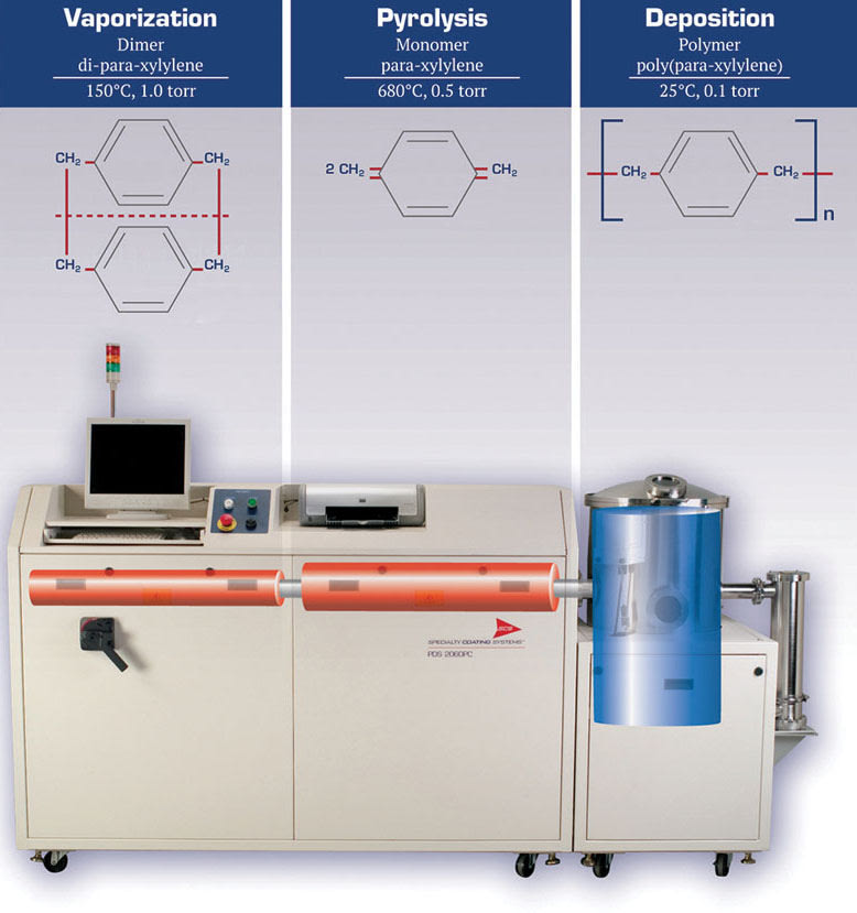 Devices to be coated with Parylene are placed in a room-temperature deposition chamber (see Figure 2). A powdered raw material, known as dimer, is placed in the vaporizer at the opposite end of the coating system. The double molecule dimer is heated, sublimating it directly to a vapor. The vapor is then rapidly heated to a very high temperature that cracks (pyrolizes) it into a monomeric vapor. This vapor then travels into an ambient temperature deposition chamber where it spontaneously polymerizes onto all surfaces, forming the ultrathin, uniform, and extremely conformal Parylene film. The entire Parylene coating process is carried out in a closed system under a controlled vacuum. The deposition chamber and items to be coated remain at ambient temperature throughout the entire process and no additional cure process or steps are required.