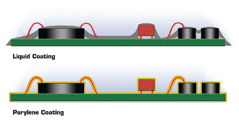 Parylene is the name for a group of vapor-deposited, organic poly(para-xylylene) polymers that are often used as moisture and dielectric barriers. What differentiates Parylene from many other types of conformal coatings is that it is applied by vapor deposition — not via spraying, dipping, brushing, or another mechanical form of liquid application (see Figure 1). It is deposited by a gas phase process that does not rely on line-of-sight physics, but literally grows on device surfaces at a molecular level, which means it provides uniform, conformal coverage of all component surfaces, even penetrating the smallest crevices to provide a complete, biocompatible barrier that is only microns in thickness.