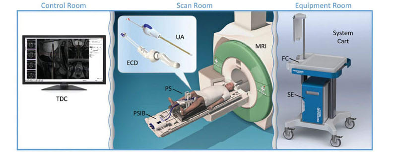 The MRI magnet room components of TULSA-PRO consist of an ultrasound applicator that delivers the therapeutic dose to the patient, the robotic positioning system of the applicator, and the interface box that includes power and drive electronics for the positioner. The ultrasound applicator features a probe with a linear array of ultrasound transducers near the tip. Controlled by a rotary and linear motor, the probe and array can be accurately positioned axially and rotationally to deliver the thermal energy exactly against the target boundary within the prostate as selected by the physician.