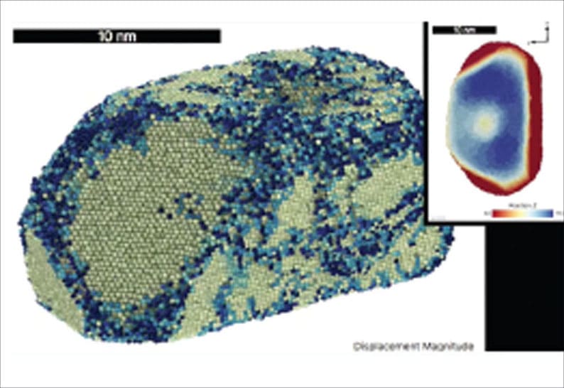 To understand the process in depth, the researchers investigated the atomic motion during indentation and heating, using atomistic molecular dynamic computer simulations. They demonstrated that the plastic deformation during the indentation process is mediated by nucleation and glide of dislocation half-loops (the dislocations are linear, one-dimensional defects in the crystal through which it undergoes plastic deformation). The loops that egress at the free surfaces form terraces and ledges on the flat facets of the particle, and these serve as guide rails, directing the diffusion of gold atoms back to the indented site during high-temperature anneal. Thus, the particle recovers its original shape.