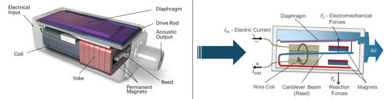 The receiver’s only function is to convert the amplified voltage signal from the microphone into sound. While the construction appears simple, the process is rather complex (see Figure 2). The electrical signal is first converted to a magnetic signal, then to a mechanical signal, and finally into an acoustic signal. Each of these steps has its own frequency-dependent characteristics. Understanding the combined effects of all the internal components is vital to the ability of effectively designing receivers for all different hearing aid platforms. Engineers at Knowles have been using complex circuit-equivalents to model all of their internal electrical-magnetic-mechanical-acoustic effects since the 1960s.