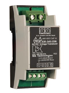 NK Technologies, San Jose, CA, has introduced a high-performance true RMS transducer for sensing voltage in single, three-phase, or DC installations. Housed in a 35-mm wide DIN rail mounting enclosure, the VTU-DIN measures from 0-15 to 0-600 V with an industry standard output proportional to connected voltage in AC circuits with sinusoidal or nonsinusoidal (variable frequency) applications or DC circuits. Standard outputs make the VTU-DIN reliable and easy to use with existing controllers, data loggers, and SCADA equipment. It effectively detects a wide range of conditions that may cause damage to the motor and/or soft starter components.