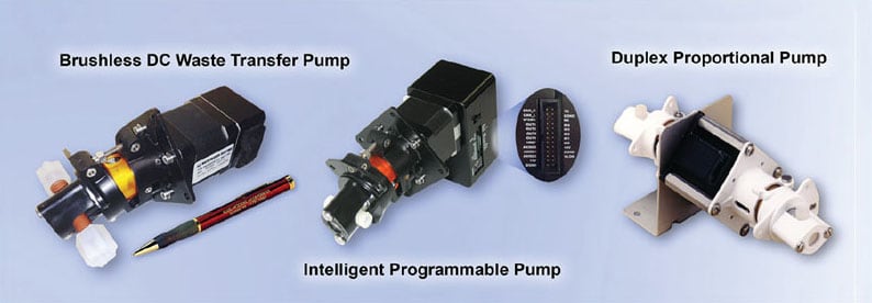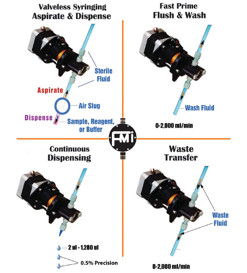 Design Versatility. The valveless piston pump is available in a wide variety of configurations to meet a broad range of medical, analytical, and laboratory automation instrumentation requirements. Typical fluid control functions include aspirating and dispensing, discrete dispensing, flush and wash, and waste fluid removal (see Figure 4).