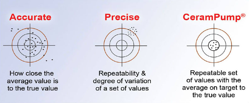 Drift-Free Accuracy and Precision. Consistency in dispensing can be measured by monitoring both the accuracy and precision of the dispenses. Accuracy is a comparison of the average value of the dispense volume compared with the desired or target value. Precision is the range or degree of variation from dispense to dispense. Having one moving part in the fluid path, eliminating valves, and utilization of ceramic internal components results in a pump that will maintain 0.5 percent drift-free precision (see Figure 3).