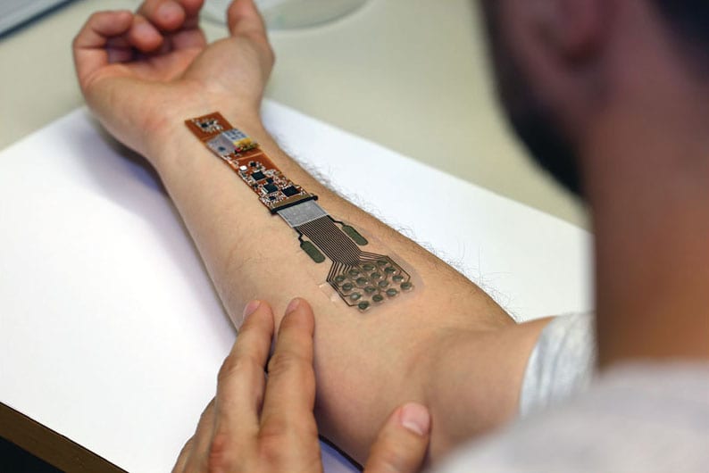 The electrodes are protected by another laminated layer of the film. On top of this lamination lies a 3D printed wound care gel containing nanocellulose, alginate, and glycerol as the active ingredients. The FlexNode reader wirelessly transmits temperature or bioimpedance data from the wound to a computer used by the healthcare team. The reader can be connected to the wound and attached to the patient with gauze.