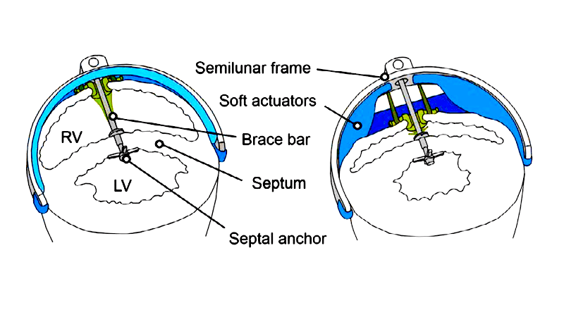 Researchers have developed a soft robotic solution. The rigid brace component is deployed via a needle into the heart’s intraventricular septum, the wall of tissue between the heart’s chambers, to prevent the septum from shifting under the pressure of the artificial “muscle” of the soft actuator. In contrast, existing ventricular assist devices (VAD) don’t involve the septum at all.