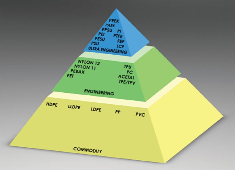 As noted in Part 1 of this article (January 2018), ultra-engineering polymers fall under the general classification of engineered polymers, yet they are at the pinnacle of performance for all thermoplastics. Ultra-engineering polymers bridge the performance gap between standard engineering polymers, such as nylon and polycarbonate; and metals, composite materials, and thermoset plastics like polyimide (see Figure 1). Their description of “high heat polymer” indicates not only that these materials are processed at higher temperatures, typically between 600° and 750° F+, but that they subsequently, also have high continuous operating temperatures, most well over 300° F.