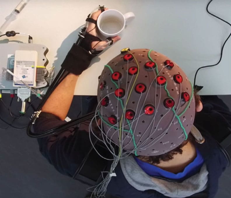 The scientists decided to pursue brainwave-control of the exoskeleton via an EEG headset that measures the users’ brainwaves as they used the exoskeleton. They found that the hand motions induced by the device elicit brain patterns typical of healthy hand motions. But they also discovered that exoskeleton-induced hand motions combined with a user-driven brain-machine interface lead to peculiar brain patterns that could actually facilitate control of the device.