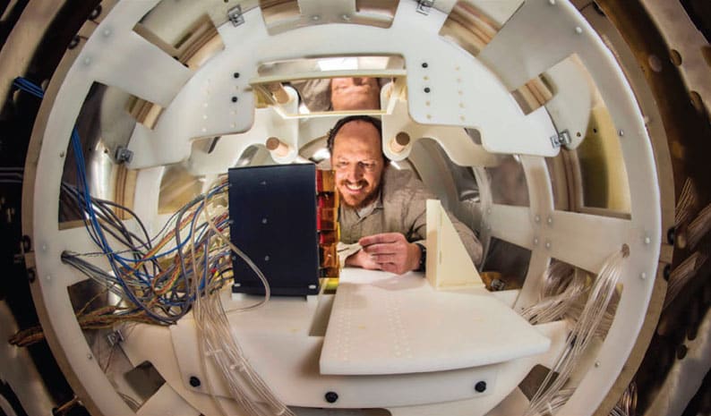 Sandia is developing an optically pumped magnetometer, or OPM, sensor array that fits against the head and is housed inside a person-sized shield resembling an MRI tube. It avoids the need for cryogenic temperatures or a shielded room, so it would be easier and cheaper to use.
