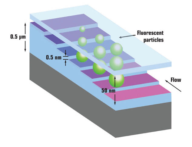 The steps of the staircase pattern precisely separated nanoparticles immersed in water according to their size. Nano-particles flowed in to the deepest step at the bottom of the staircase, but only the smaller ones could ascend toward the shallowest step at the top; larger nano-particles could not fit through and remain trapped at the bottom set of steps. Fluorescent dye within the nano-particles enabled the team to record their location with an optical microscope and match that location to the known depth of the staircase.