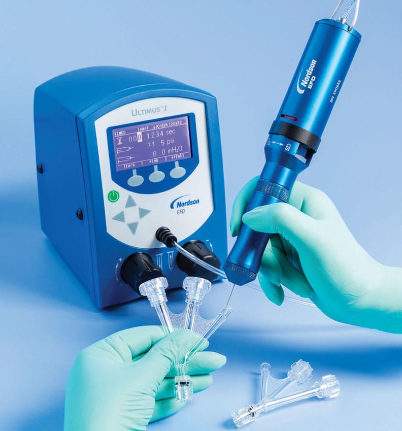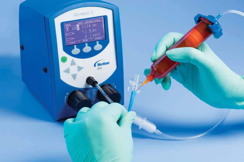 For more demanding and critical dispensing requirements, the Ultimus® series of benchtop dispensers, also from Nordson EFD, provide exceptional process control, such as for dispensing applications in the assembly of medical devices and electronics. Some of the series’ features include time adjustment as fine as 0.0001 seconds; and constant-bleed air pressure regulation for reliable control when dispensing any type of fluid. The Ultimus V allows programmable sequencing to automatically adjust dispensing parameters, making it ideal for applications that involve two-part epoxies, UV-cure adhesives, and other fluids that thicken over time or get thinner as ambient temperatures rise.