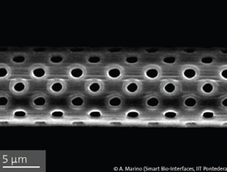 The microprinting was realized with advanced 3D printing technologies (Nanoscribe) that make use of a laser that scans through a liquid photopolymer and solidifies the material locally and layer by layer building complex 3D objects with submicron resolution. Mimicking the brain microcapillaries, the model consists of a microfluidic system of 50 parallel cylindrical channels connected by junctions and featuring pores on the cylinder walls.