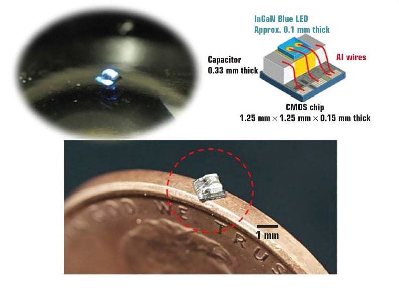 At just 1 mm3 and 2.3 mg, the volume and weight of the device are almost one order of magnitude than any other reported device, leading Tokuda to call it “the world's smallest wireless optical neural stimulator.”