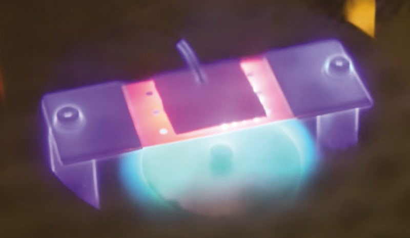 Graphene can be made by chemical vapor deposition. The method is used to create a thin surface coating on a sample. The sample is placed in a vacuum chamber and heated to a high temperature at the same time as three gases — usually hydrogen, methane, and argon — are released into the chamber. The high heat causes gas molecules to react with each other, and a thin layer of carbon atoms is created. To produce vertical graphene forms, a process known as plasma-enhanced chemical vapor deposition is used. Then, an electric field — a plasma — is applied over the sample, which causes the gas to be ionized near the surface. With the plasma, the layer of carbon grows vertically from the surface.