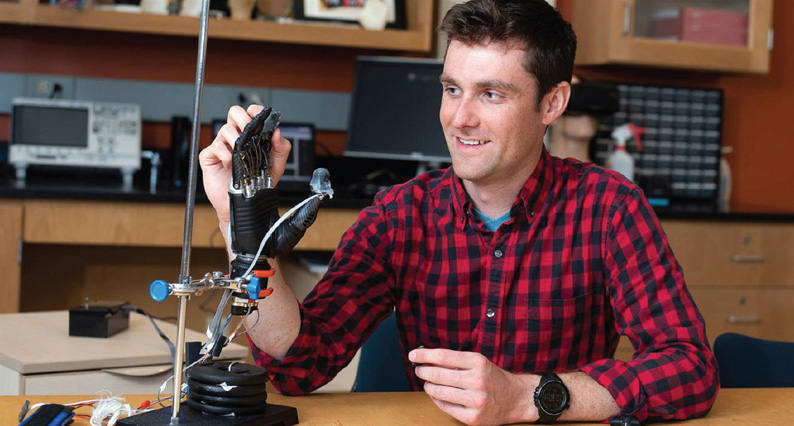 “We've made a sensor that goes over the fingertips of a prosthetic hand and acts like your own skin would,” says Luke Osborn, a graduate student in biomedical engineering. “It's inspired by what is happening in human biology, with receptors for both touch and pain.