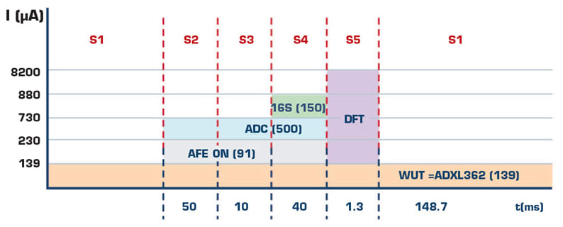 Power Consumption Study. The EDA system is formed by a state machine with different statuses to obtain the patient’s skin conductivity and ensure the minimum power consumption. Initially, in status one (S1), the EDA’s AFE is turned off and just the microcontroller and the accelerometer are on. The average current consumption is 139 µA. After approximately 150 ms, the EDA AFE is turned on, the square signal is generated by the MCU, and filtered by the LPF. The ADC reference is turned off during this stage (S2) because the signal is not stable yet. Six cycles are required to ensure the signal is stable and, in the worst case, the average current consumption in S2 is 230 µA. The ADC reference is turned on in the S3 and the system waits for 10 ms to ensure the reference is stable — the average current consumption in this stage is 730 µA. The system acquires four samples during four cycles to obtain 16 samples to implement the DFT in S4.