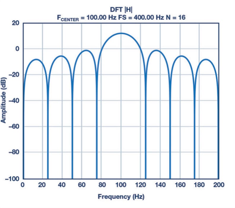 If the excitation signal is 100 Hz and the sampling frequency is 400 Hz, the zero at 50 Hz appears when N is equal to 8, 16, and 32. We must also keep in mind the number of samples must be as small as possible to minimize power. Thus, a good trade-off is to use 16 samples to implement the DFT. The number of samples can be increased to improve the SNR if it is required. Of course, if the noise is the 60 Hz noise instead of the 50 Hz, the sampling frequency should be 480 Hz and the excitation frequency should be 120 Hz. The frequency response is shown in Figure 3 and the mathematical equation, which only involves addition, is shown in Equation 3.