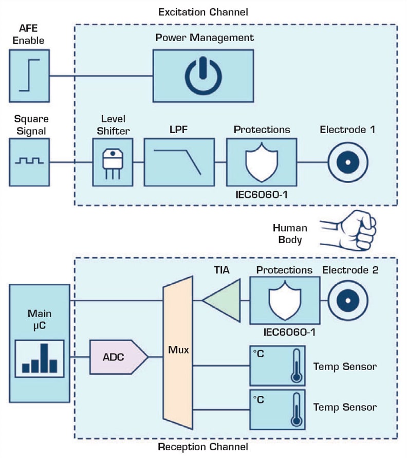 The final decision is to use an ac voltage source as the excitation source and measure the current through the patient’s body to determine the skin conductivity. This solution avoids high voltages over single sweat glands, eliminating the danger of sweat gland damage and allowing the compliance of the IEC 60601 standard. The ac signals eliminate the problem of electrode polarization.7