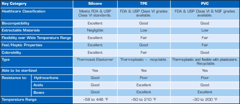 A variety of silicones are available, so it is critical to select the right one for the application (see the sidebar, “Selecting the Appropriate Healthcare-Grade Silicone Elastomer.” Wacker, for example, offers several families of extrusion-grade elastomers for healthcare applications. These materials comply with USP Class VI, ISO 10993, FDA 21 CFR 177.2600, German BfR, and European Pharmacopoeia 3.1.9.