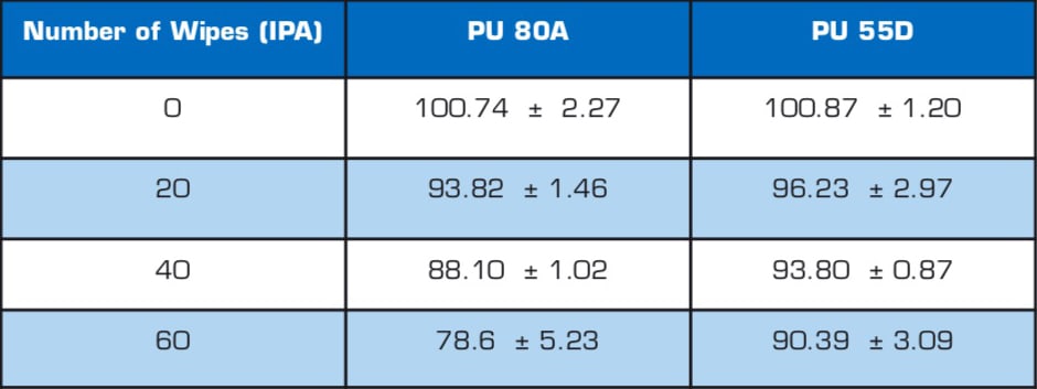 The first surface preparation factor studied was the effect of surface cleaning on surface wettability, specifically whether and to what extent multiple cleaning passes impact the contact angle on the two polyurethane substrates.