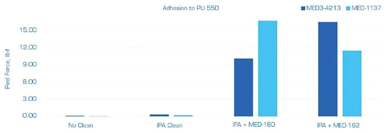 The tests were repeated on the Pellethane® 2363 55D polyurethane, using the same surface cleaning, silicone adhesives, and surface primers (see Figure 4). For this substrate, although only slight improvements in peel force were shown with surface cleaning alone, significant improvements were shown through the use of both NuSil primers, with the NuSil MED-160 primer on MED-1137 adhesive outperforming the rest.