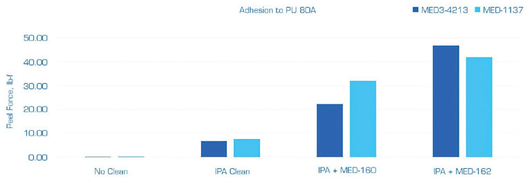 The first test assessed adhesion and the effect of surface treatments on the Pellethane® 2363 80A polyurethane (see Figure 3). The polyurethane panel and a sheet of silicone were adhered using NuSil MED3-4213 and MED-1137 silicone adhesives with and without the use of the two primers.1 Peel force tests were conducted using an Instron 3345 tensile tester set at a 20 in./min pull rate, and the peak force was reported. Significant improvements were shown with surface cleaning alone, and even more so when primers were used, with the NuSil MED-162 primer providing the most effective improvement in adhesion for both silicone adhesives tested.