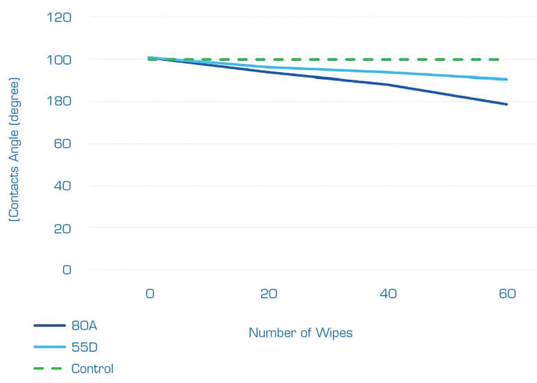 The surfaces of both substrates were wiped using isopropyl alcohol with a mechanical wiping device to eliminate inconsistencies in manual wiping, such as pressure against the substrate and area to be cleaned. The contact angle was measured after 20, 40, and 60 wipes and compared with the contact angle without cleaning. Results showed that cleaning the surface significantly improves the contact angle (see Figure 2 and Table 1).