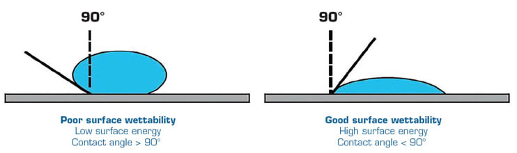 The contact angle of the substrate surface helps quantify the wettability of the surface. In general, a contact angle below 90° has high surface energy and provides good surface wettability, while a contact angle greater than 90° has low surface energy, with a greater likelihood of adhesion failure due to blank spots on the substrate surface where no adhesive is present (see Figure 1).