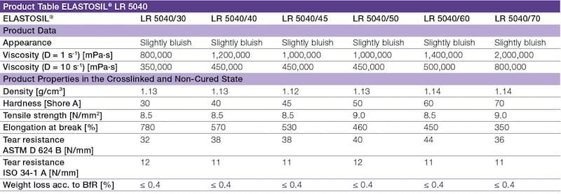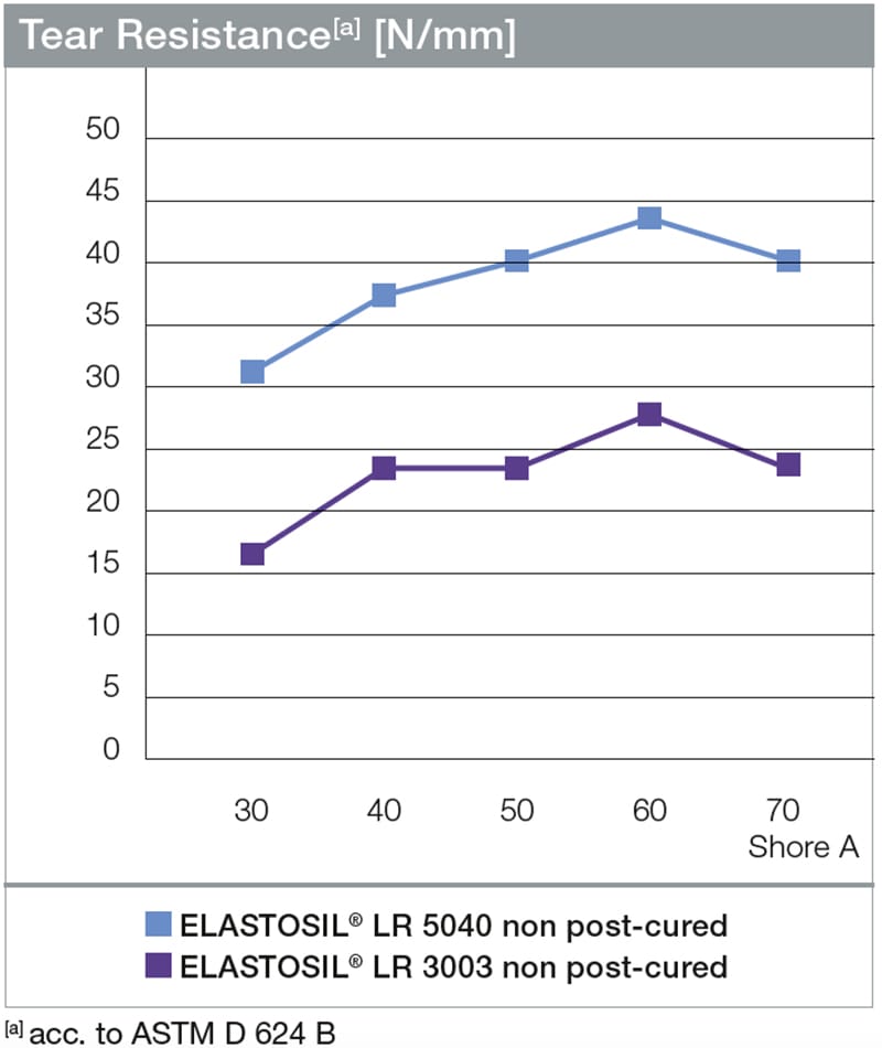 ELASTOSIL® LR 5040 LSRs are fast-curing, liquid silicone rubber grades (see Table 1). After curing, they have excellent properties even without post-curing: