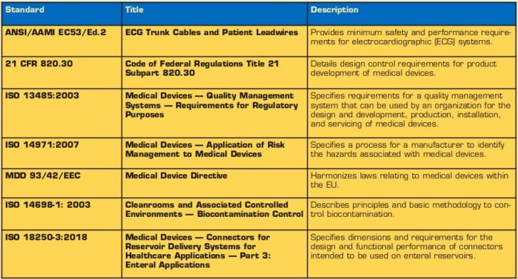 There are no other cable-specific standards. However, Table 1 identifies additional relevant medical device standards. The practices for ensuring that any of these standards are met could extend to the interconnect. For instance, FDA 21 CFR 820.30 subpart for medical devices defines requirements for sterility to prevent the growth of microorganisms. ISO 14971, which is a risk management standard, encourages manufacturers to use specific connectors that cannot be connected to the wrong component, thereby mitigating any human error. All of these are considerations that have a direct impact on connector and cable design.