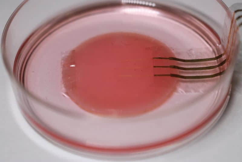 For this research, collaborators from Tokyo Women's Medical University supplied a healthy culture of cardiomyocytes derived from human stem cells. The base for the culture was a very soft material called fibrin gel. Lee placed the nanomesh sensor on top of the cell culture in a complex process, which involved removing and adding liquid medium at the proper times. This was important to correctly orient the nanomesh sensor.